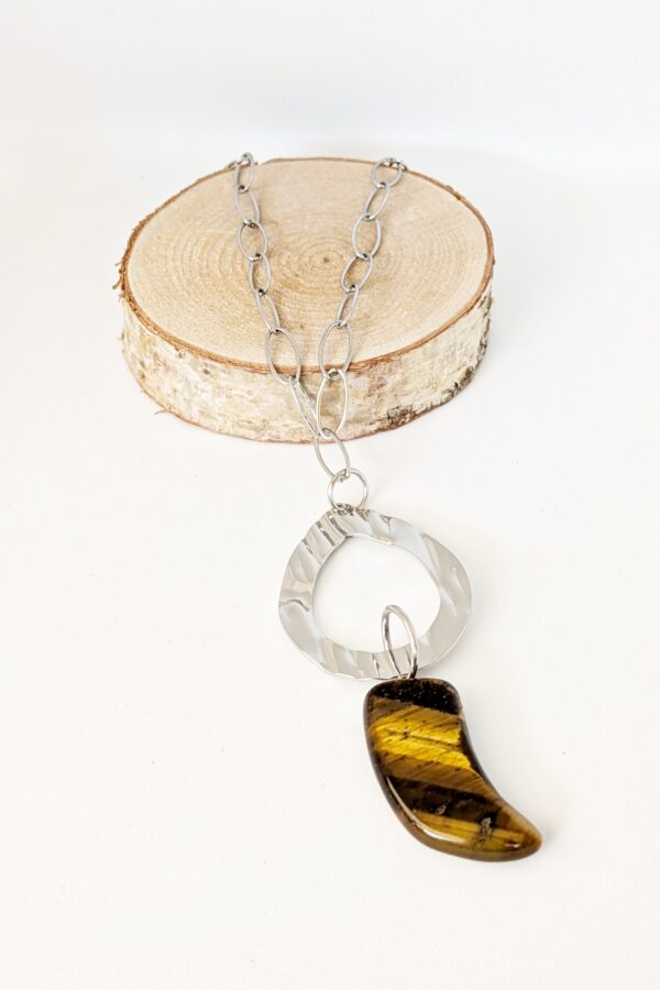 El Collar Eye of Tigris fusiona materiales nobles y diseño contemporáneo, combinando acero inoxidable, cuerno de piedra natural y la energía única del ojo de tigre.