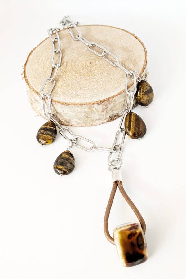 La cadena, de líneas limpias y modernas, resalta los reflejos dorados y marrones de la piedra, creando un contraste sutil entre la fuerza del metal y la calidez de la naturaleza.