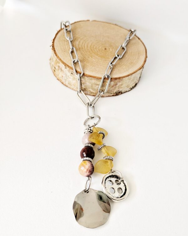 Este collar combina la resistencia del acero inoxidable con la suavidad de las piedras en tono tierra y el brillo sutil de hojas de cristal, creando un equilibrio perfecto entre fuerza y delicadeza.
