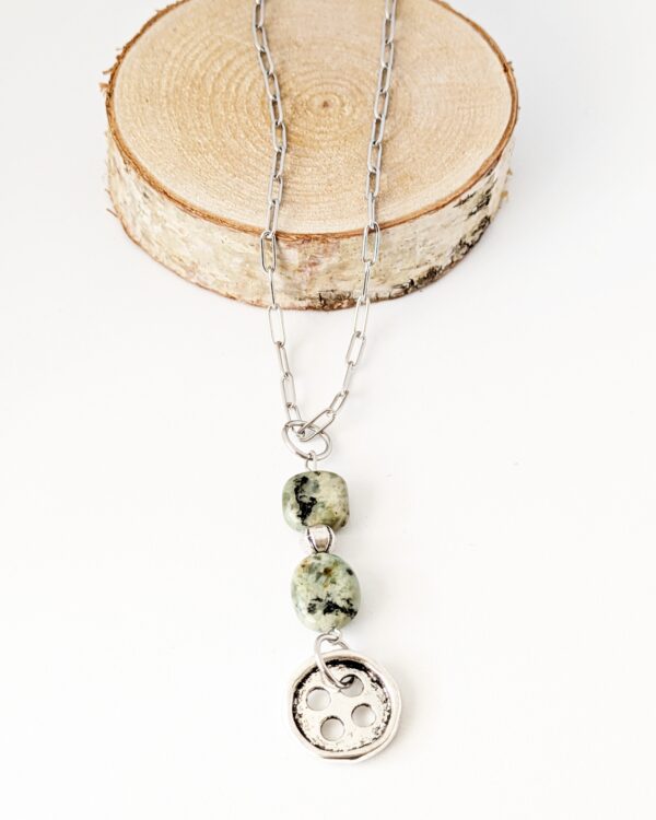 El collar Luz del Desierto combina la fuerza del acero con el brillo del zamak bañado en plata, creando una pieza moderna y duradera. En el centro dos piedras turquesa africana aportan un toque de color y energía, evocando  los paisajes luminosos y cálidos del desierto. Un diseño que une elegancia, simbolismo y estilo atemporal, ideal para realzar cualquier look con un aire natural y sofisticado.