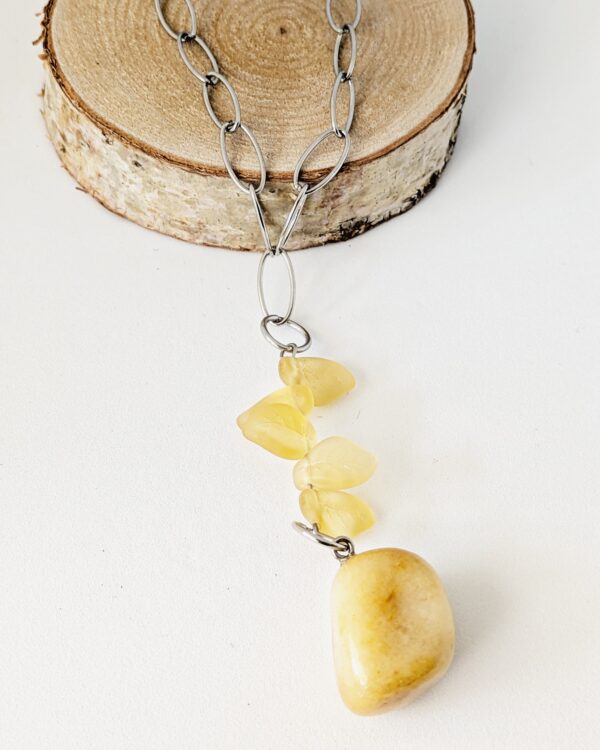 Elaborado en acero inoxidable, este collar se realza con una piedra natural y hojas de cristal en tonos ocre, que reflejan la luz con sutileza y elegancia.