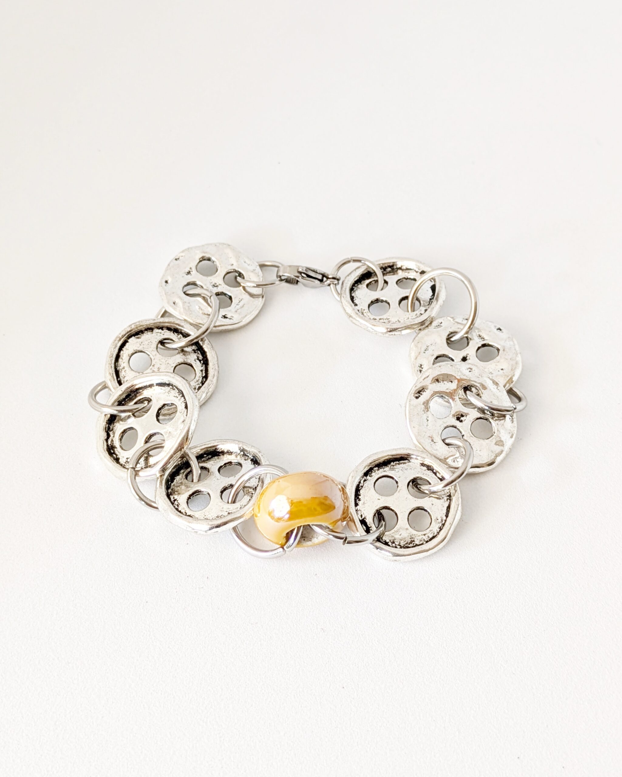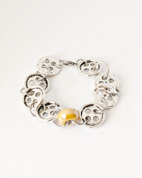 Una pulsera que irradia calidez y estilo. Elaborada en zamak de alta calidad, destaca por su pieza central de cerámica en tono ocre, símbolo de equilibrio y energía natural. Su diseño combina la sofisticación del metal con la textura artesanal de la cerámica, creando un accesorio versátil y lleno de carácter.
